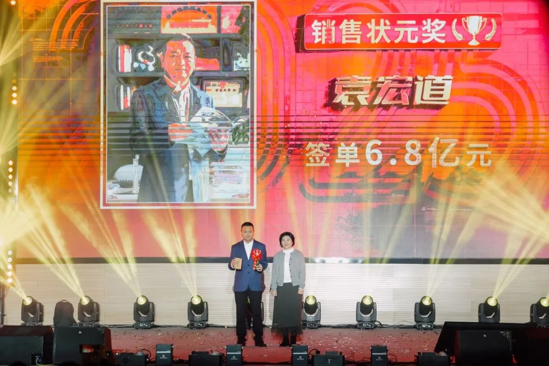 ▲河南通达电缆股份有限公司董事长马红菊为销售冠军颁奖、合影留念