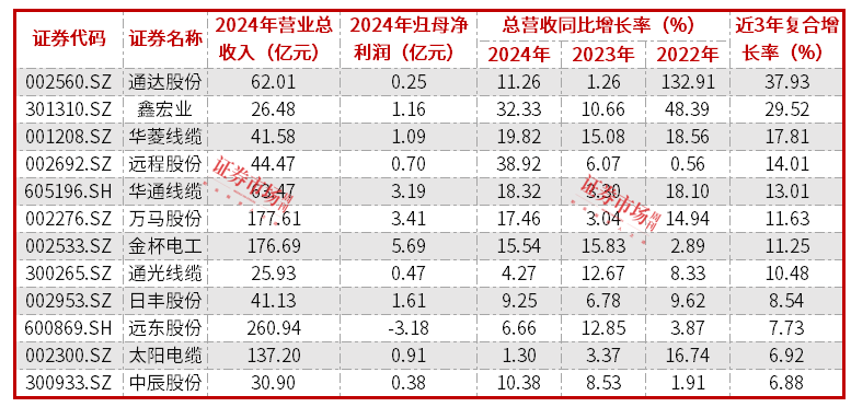 单家公司方面,有24家公司实现了营收同比增长,其中营收增速超过10%的公司有18家,而远程股份、泓淋电力、露笑科技、鑫宏业等公司营收同比增幅甚至超过30%。在实现营收增长的公司中,通达股份、鑫宏业、华菱电缆等12家公司还实现了营收连续3年增长(见表1),其中,通达股份近3年总营收复合增长率达37.93%,是实现总营收连续增长的12家公司中表现最好的。