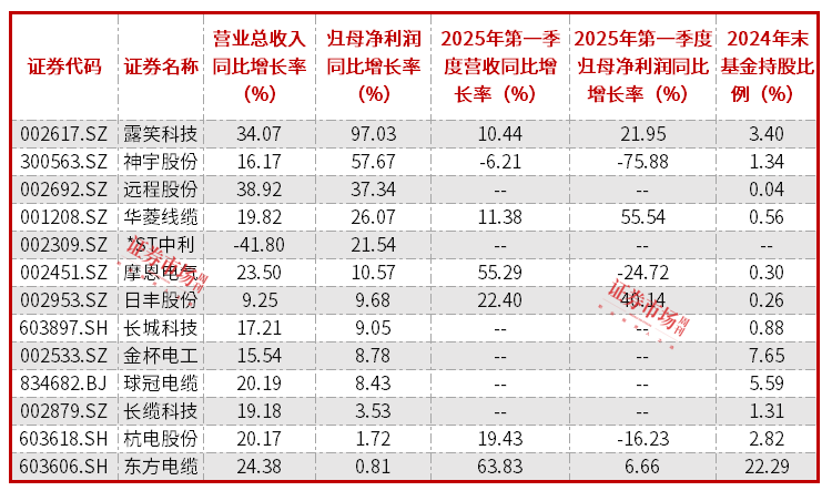 或是其持续分红特点,除*ST中利外,33家发布2024年年报的线缆公司均获基金持仓。其中,东方电缆、华通线缆、金杯电工持仓占比居前,基金持仓比例分别为22.29%、18.56%、8.81%,这一持仓比例相比2023年末的持仓分别增加了2.53个百分点、15.98个百分点、2.42个百分点。此外,球冠电缆、杭电股份等也获得机构增仓。