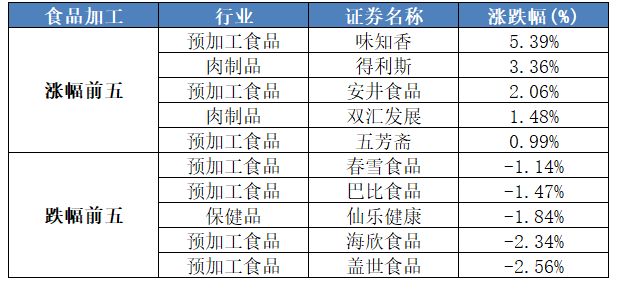 食品加工行业中涨幅前五的公司有味知香(5.39%)、得利斯(3.36%)、安井食品(2.06%)、双汇发展(1.48%)和五芳斋(0.99%);跌幅前五的有春雪食品(-1.14%)、巴比食品(-1.47%)、仙乐健康(-1.84%)、海欣食品(-2.34%)和盖世食品(-2.56%)。