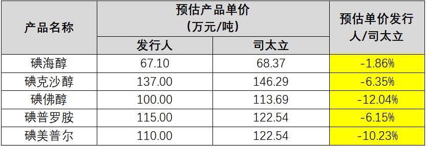 再次,发行人所预测募投项目毛利率水平也可能过高。发行人所估算此次募投项目的毛利率达24.96%,并以其毛利率低于可比公司司太立碘造影剂产品2020年至2023年1-6月期间以及其2023年募投项目毛利率为由,而认定其测算结果具有谨慎性。但就估值之家看来,此种说辞的合理性明显较低。一方面,从产品价格上看,发行人各项产品的预估销售价格与司太立相比均不具有竞争优势,甚至在同质化较强的原料药领域,部分产品预估销售价格已经相差超过10%。另一方面,从规划项目产能上看,司太立2023年募投项目整体建设产能为1,550吨,较发行人募投项目产能高出达34.78%,规模效应明显高于可比公司的情况下,其预计毛利率水平也理应明显优于发行人。然而,反观司太立2023年募投项目的估算毛利率为25.27%,发行人测算项目毛利率水平仅比司太立低了微乎其微的0.31个百分点,其所宣称的低于可比公司、谨慎性估算毛利率,实际上为两者基本相当。同时,结合发行人现有400吨碘造影剂项目投产后三年内毛利率仍然为负,且亏损还呈现明显扩大趋势的实际经营情况,估值之家认为,发行人仅仅以估算毛利率与国内行业龙头标杆项目基本相当为基准,而并未结合自身现有项目目前经营情况来评定其募投项目毛利率合理性与谨慎性,其相关解释说明实属过于单薄与牵强。