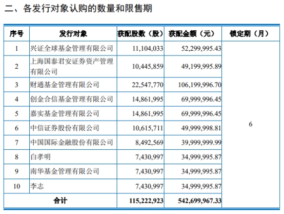 兄弟科技于2021年1月5日披露的《非公开发行股票发行情况及上市公告书》显示,本次发行对象包括兴证全球基金管理有限公司、上海国泰君安证券资产管理有限公司、财通基金管理有限公司、创金合信基金管理有限公司、嘉实基金管理有限公司、中信证券股份有限公司、中国国际金融股份有限公司、南华基金管理有限公司等。