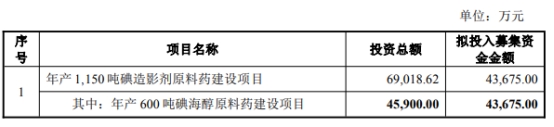 公司年产1,150吨碘造影剂原料药建设项目总投资为69,018.62万元,完全达产后年新增1,150吨碘造影剂原料药的生产能力,包括600吨碘海醇、200吨碘克沙醇、200吨碘佛醇、100吨碘普罗胺、50吨碘美普尔。其中,本次募投项目“年产600吨碘海醇原料药建设项目”投资总额45,900.00万元,拟募集资金投入金额为43,675.00万元,完全达产后年新增碘海醇原料药产能600吨。
