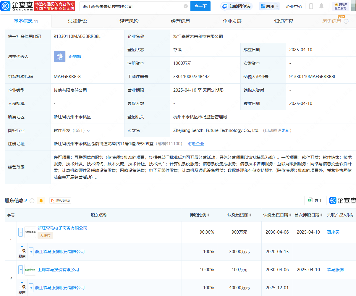 近日,浙江森智未来科技有限公司成立,法定代表人为路丽娜,注册资本为1000万元,经营范围包含:互联网信息服务;软件开发;软件销售;计算机系统服务;信息系统集成服务;网络设备销售;电子元器件零售等。股权穿透显示,该公司由森马服饰(002563)间接全资持股。