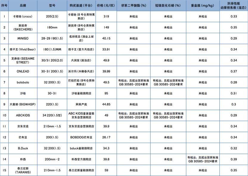据介绍,深圳市消委会工作人员从线下商超及线上平台随机采购了15款儿童洞洞鞋,涵盖卡骆驰(crocs)、斯凯奇(SKECHERS)、MINISO等知名品牌,价格区间从26.17元至319元,基本覆盖市场主流价位段。比较试验围绕消费者关心的化学安全与防滑性能,依据GB30585—2024《童鞋安全技术规范》及QB/T4552—2020《拖鞋》两项标准开展,重点测试邻苯二甲酸酯、重金属总量、短链氯化石蜡等有毒有害物质含量,以及湿态动摩擦系数等防滑指标。