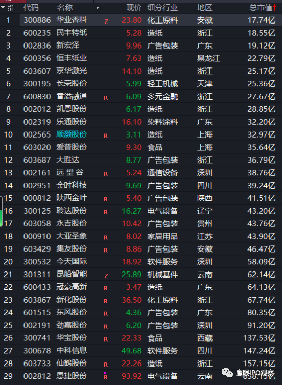 经济导报记者发现,目前A股市场共有29家上市公司具有烟草概念。其中市值最低的为华业香料(300886),总市值为17.7亿元;市值最高的为恩捷股份(002812),总市值为838亿元。