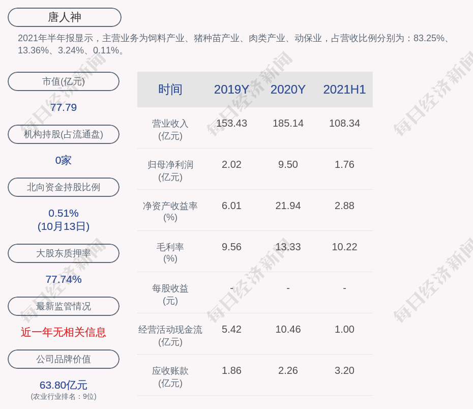 2021年半年报显示,唐人神的主营业务为饲料产业、猪种苗产业、肉类产业、动保业,占营收比例分别为:83.25%、13.36%、3.24%、0.11%。