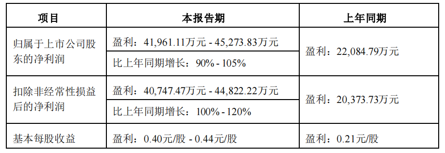 7月4日,百润股份披露半年度业绩预告,预计上半年归母净利润为4.2-4.53亿元,同比增长90%-105%;扣非净利润预计为4.07-4.48亿元,同比增长100%-120%。