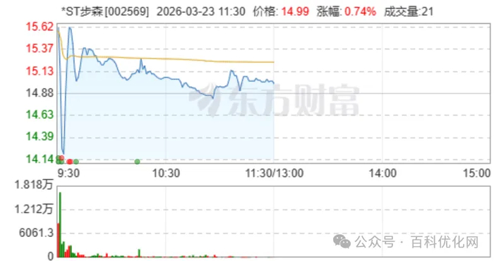 3月23日早盘,A股退市风险警示股*ST 步森(002569.SZ)上演了一场惊心动魄的股价异动。复牌仅7分钟,该股便完成从跌停到涨停的"天地天板"反转,盘中振幅高达9.95%,截至上午收盘,股价微涨0.74%,换手率5.09%,成交额达1.09亿元。投资参考网记者注意到,这场股价狂欢背后,是市场对公司易主后业务转型的强烈预期,而公司紧急澄清的股权关系疑云,更让这场保壳攻坚战充满看点。