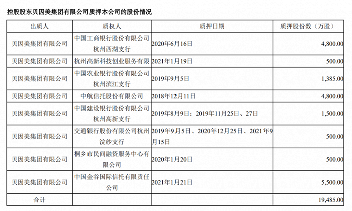 根据贝因美2021年年报,包括中航信托在内,贝因美集团质押股份的机构共有8家。除了中航信托,还有4家机构也已过了质押期限,分别是农行杭州滨江支行、建行杭州高新支行、交行杭州浣纱支行以及桐乡民融。