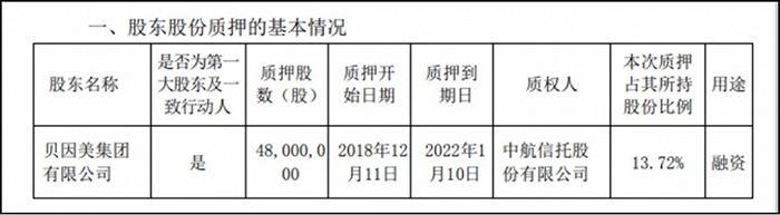 2018年12月,贝因美集团与中航信托签订了协议,约定贝因美向中航信托融资2.33亿元,融资条件为贝因美向中航信托质押其所持有的4800万股本公司股份。据协议显示,双方约定的质押到期日为2022年1月10日,如今已经逾期一年。