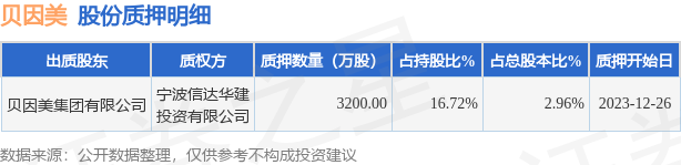 贝因美(002570)12月28日公开信息显示,股东贝因美集团有限公司向宁波信达华建投资有限公司合计质押3200.0万股,占总股本2.96%。质押详情见下表: