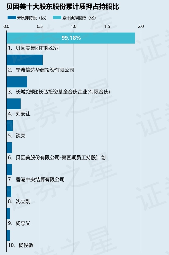 截止本公告日,股东贝因美集团有限公司已累计质押股份1.9亿股,占其持股总数的99.18%。本次质押后贝因美十大股东的累计质押股份占持股比例见下图: