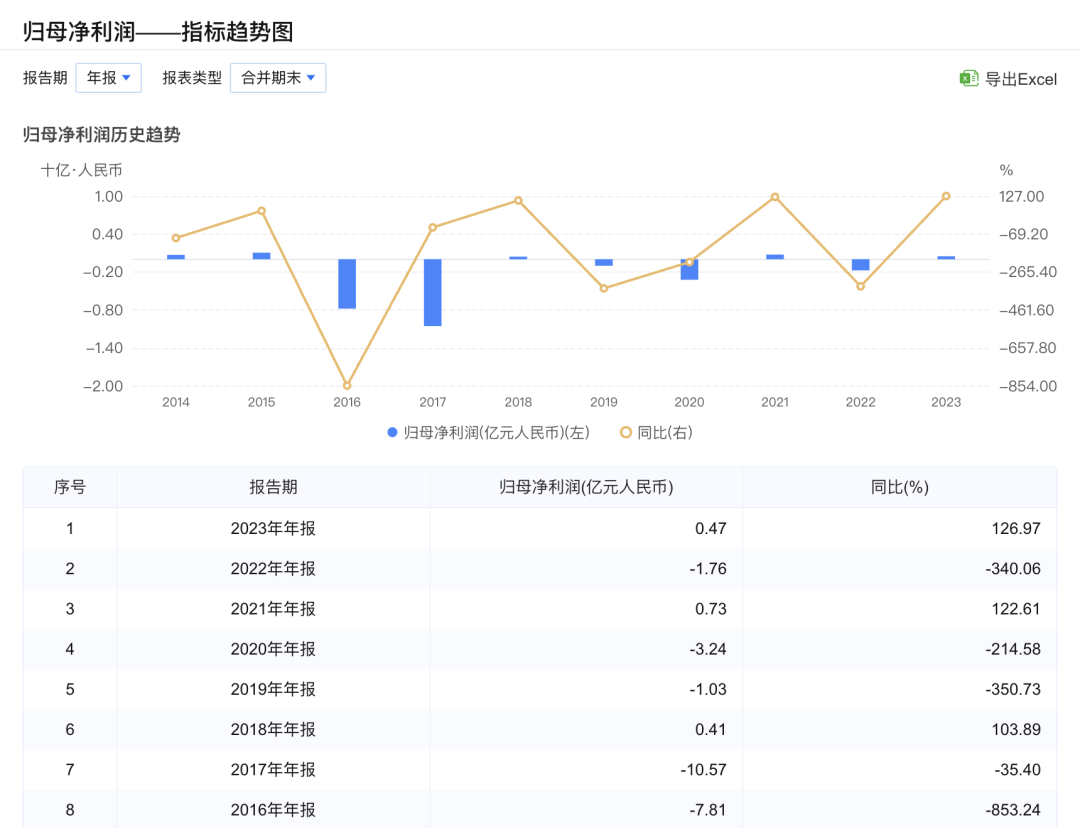 贝因美近十年归母净利润变动(来自企业预警通APP)