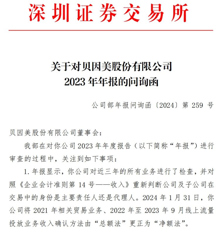 对此,深交所要求贝因美:(1)说明本次会计差错更正涉及的具体业务情况,包括但不限于业务类型、业务开展时间、是否为2023年新增业务、业务模式、贸易业务及线上流量投放业务主要合同条款、公司在相关业务中的权利与责任、是否存在真实货物流转、前期收入成本确认情况、前期采用总额法确认收入的依据、报告期改按净额法对销售收入进行确认的原因等;