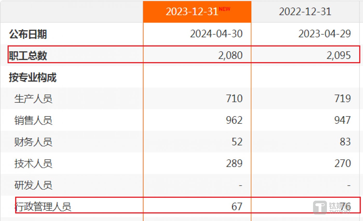 财报显示,2023年公司管理费用2亿元,同比增长17.26%,其中人工费用1.15亿元,同比增长28.96%。不过,从职工构成来看,这些费用大幅增加似乎存疑。数据显示,2022年,公司行政管理人员为76人,2023年该数据为67人。