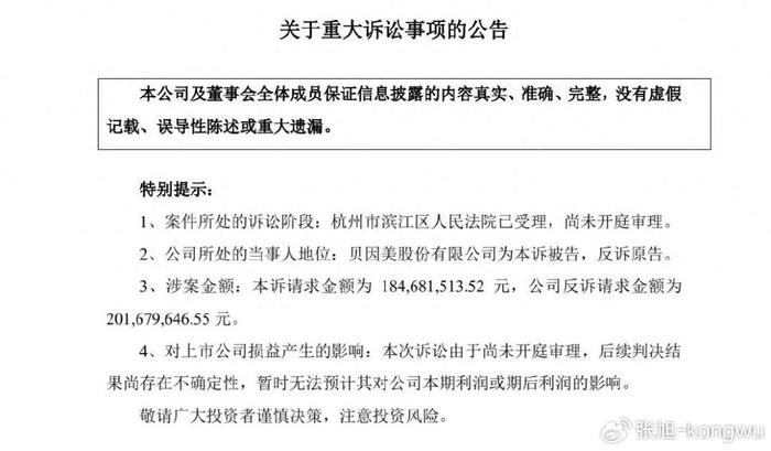 本诉案件中,科露宝在《起诉状》中提出诉讼请求金额暂合计为127,554,605.87 元,之后,科露宝又提交《变更诉讼请求申请书》,将原诉讼请求金额变更为 184,681,513.52 元。同时,贝因美提起反诉,要求科露宝支付各项损失合计 201,679,646.55 元。