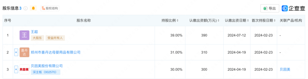 根据2024年半年报披露的信息,今年2月23日,杭州贝因美特医营养食品有限公司完成注册登记。该公司主要开展特配粉的销售业务,由贝因美与郑州市喜丹达母婴用品有限公司、自然人王超共同投资设立。其中,贝因美以商标使用权评估出资300万元,占注册资本的30%;喜丹达认缴出资310万元,占注册资本的31%;王超认缴出资390万元,占注册资本的39%。