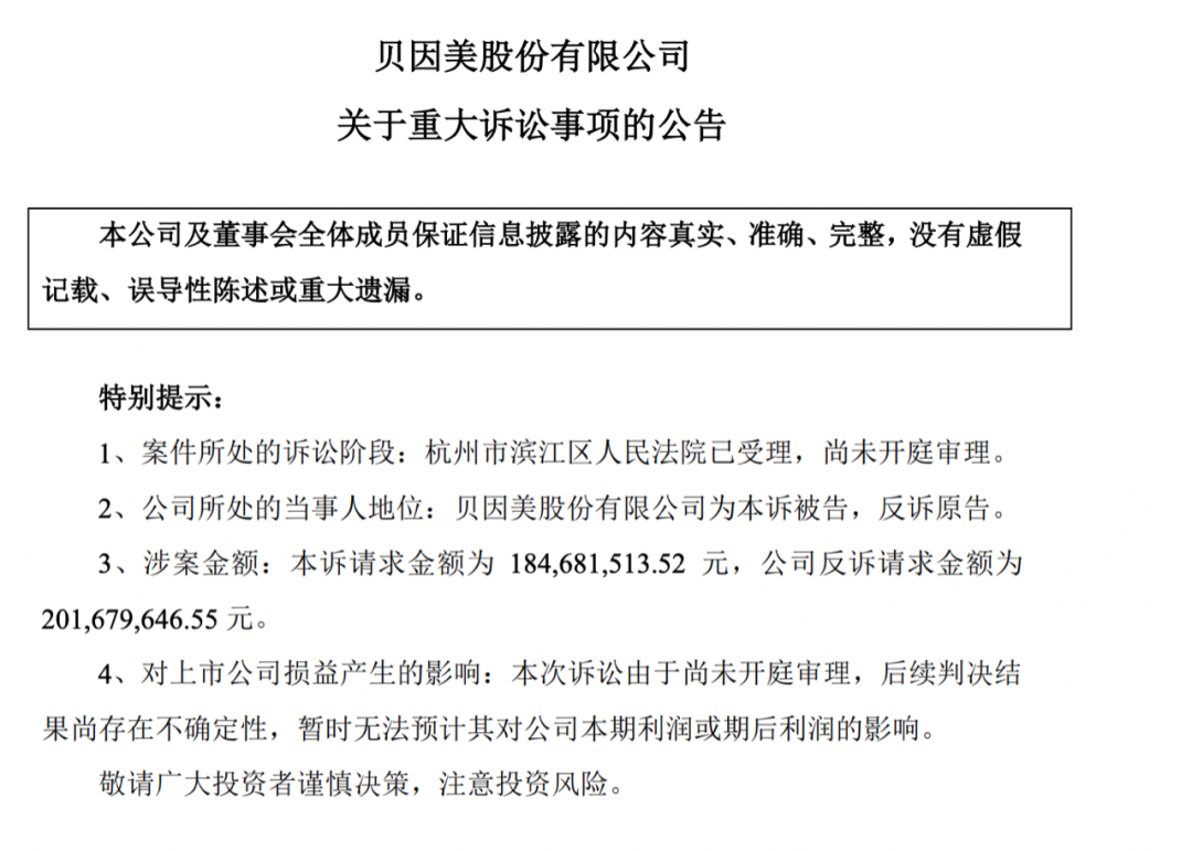 12月9日晚间,贝因美披露了一则重大诉讼事项公告。公告显示,贝因美与浙江科露宝食品有限公司(以下称“科露宝”)销售代理合同纠纷已在杭州市滨江区人民法院立案,贝因美作为本案被告已向原告发起反诉,要求科露宝支付各项损失合计约2.02亿元。