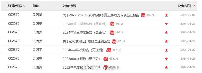 值得注意的是,贝因美因业绩多次更正而被称为A股“变脸王”。笔者在深交所搜索发现,自2011年来,与更正有关的公告多达37条。4月29日,贝因美发布多项业绩更正相关的公告,涉及2022年和2023年年报,以及2024年一季度、半年报和三季报。