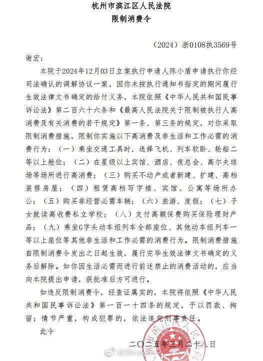 值得一提的是,2025年3月28日,杭州市滨江区人民法院向谢宏发出了限制消费令。限制消费令显示,贝因美董事长、实控人谢宏因未按执行通知书指定的期间履行生效法律文书确定的给付义务,对其采取限制消费措施。该案被执行标的金额41.4246万元。