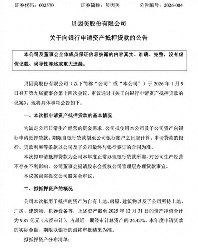 1月9日晚间,贝因美公告称,公司为满足日常生产经营的资金需求,拟使用自有及子公司资产向银行申请抵押贷款。公司表示,此次贷款属于公司本年度正常融资安排,不会对公司经营造成不利影响。