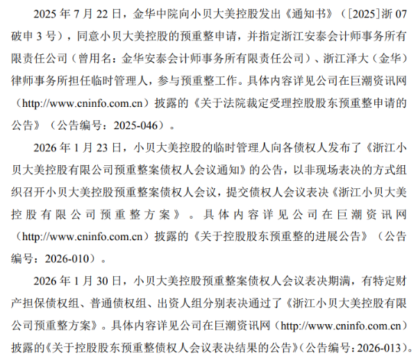 今年1月30日,小贝大美控股预重整案迎来实质性进展。公司公告称,有特定财产担保债权组、普通债权组、出资人组分别表决通过了《浙江小贝大美控股有限公司预重整方案》。