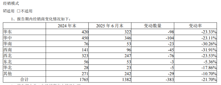 值得注意的是,经销渠道作为贝因美销售体系的重要支柱,在2025年上半年出现了明显的收缩与波动。2025年半年报显示,公司来自经销商的收入同比下滑15.38%。与此相应,其经销商网络规模也显著缩减:截至2025年6月末,经销商数量为1382家,相比2024年末减少了383家。