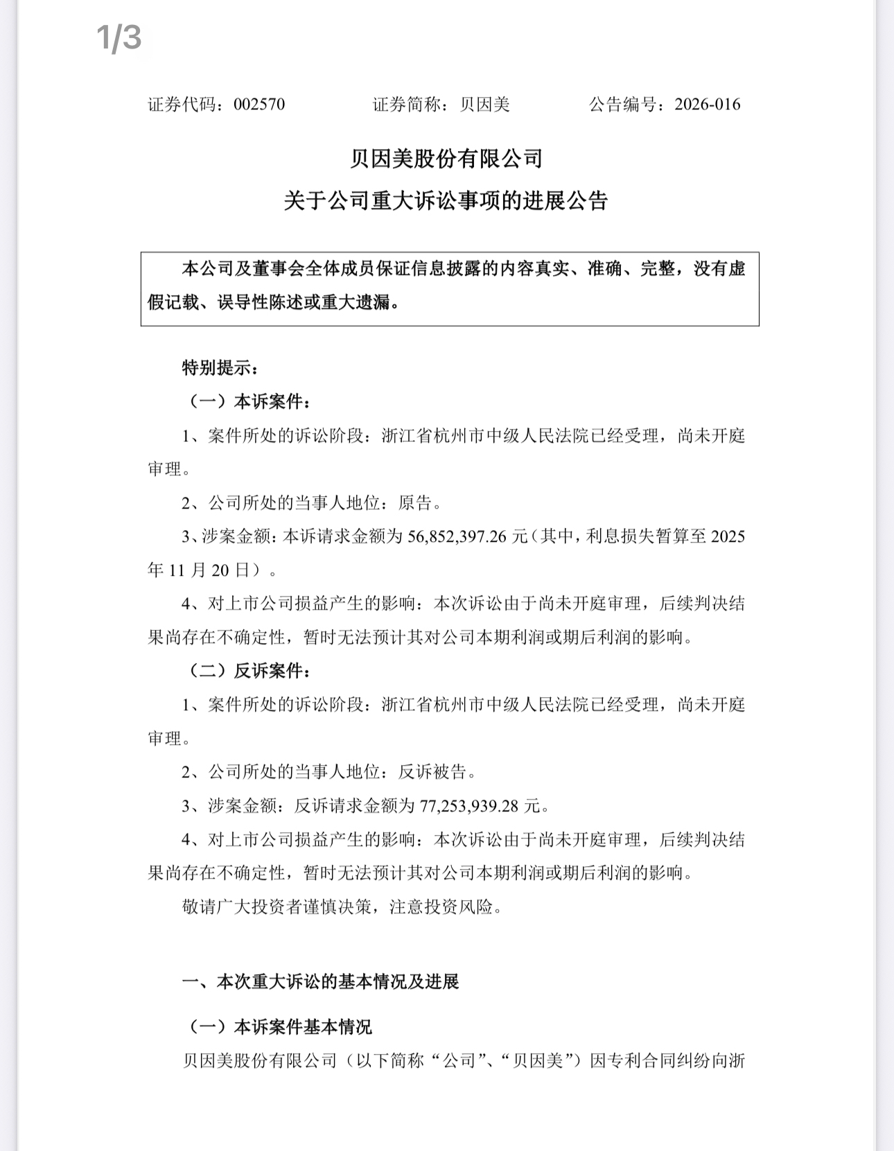 事情得从2月24日晚说起,贝因美发了份公告,说自己跟合作方黑龙江丰佑的专利纠纷有了新进展。原本是贝因美起诉对方,要求退回5000万定金加利息,总共5685万元。没想到对方直接反诉,反过来索赔7725万元。这一来一回,双方扯皮的金额加起来超过了1.3个亿。