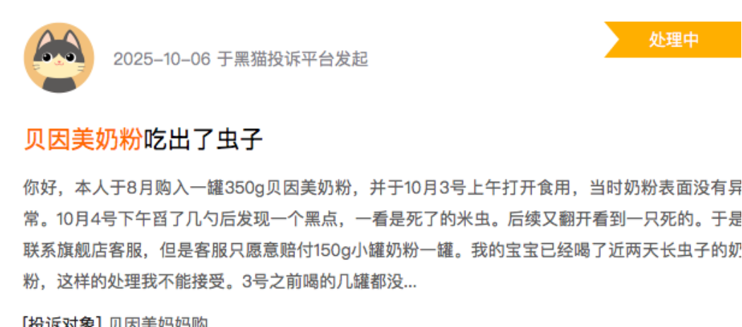 截至目前,黑猫投诉平台上针对贝因美的投诉,涉及临期奶粉违规销售、产品质量问题等,有消费者明确反馈,奶粉吃出虫子。