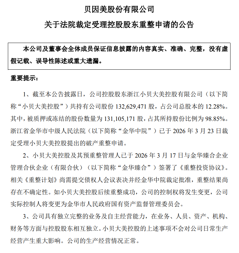 3月的一纸公告,给国产奶粉第一股贝因美三十年的浮沉,写下了最具讽刺性的注脚。这家曾在三聚氰胺事件中独善其身、凭“安全”标签登顶行业的龙头企业,如今发布重整公告,8.56亿元引资落地后,实控人将从创始人谢宏变更为金华市国资委,迎来上市以来最大的控制权变局。