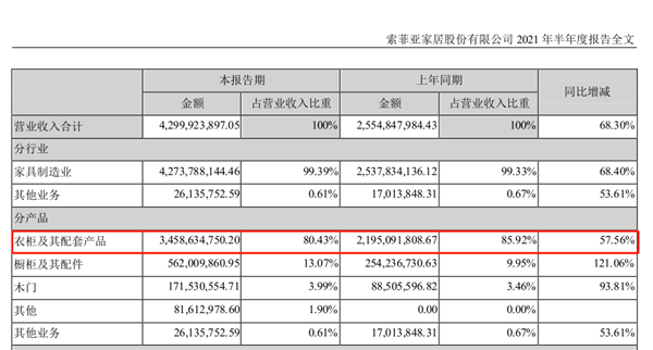 按照索菲亚财报的披露惯例,“衣柜及其配套产品”被合并项统计。根据财报显示2021年上半年索菲亚“衣柜及其配套产品”实现收入34.59亿元,同比增长57.56%。至于衣柜和配套产品单独的营收分别是多少,索菲亚在此次财报中并没有披露。