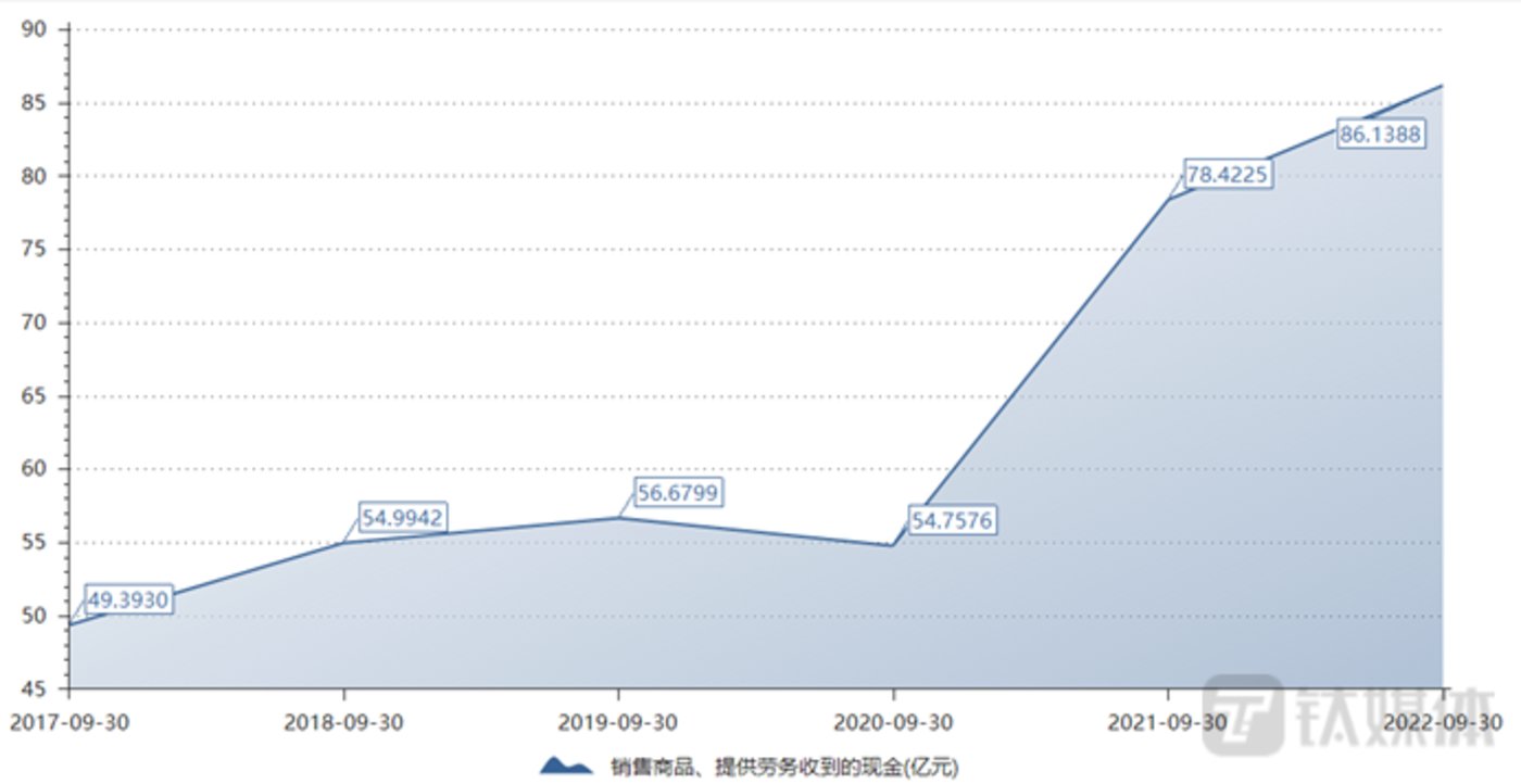 如果将销售额比率纳入计算,按索菲亚此前销售收入的高增速,预计资产增加值将进一步缩减资金缺口的数值。现金流量表显示,索菲亚销售商品、提供劳务的收入连年高速增长,经营性现金流净额稳定上升,由于最新年报尚未发布,单看2019年-2022年前三季度数据分别为6.03亿、4.8亿、5.27亿、8.66亿,“造血”能力在线。