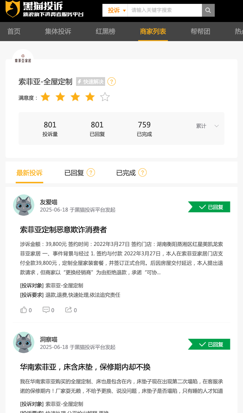 以上媒体报道的消费者遭遇并非孤例。据统计,今年“3·15”后一个月内,黑猫投诉平台关于索菲亚的投诉就激增至几十条,问题集中于板材变形开裂、甲醛异味刺鼻、售后响应迟缓及项目烂尾等环节。