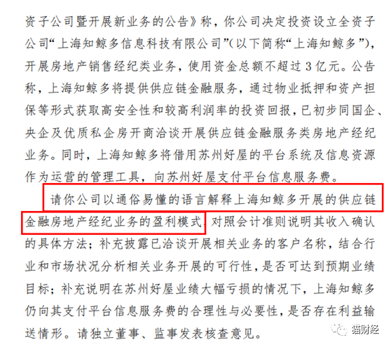 另外,针对公司近日设立的上海知鲸多信息科技有限公司(上海知鲸多)的业务模式,深交所要求公司用通俗易懂的语言解释供应链金融房地产经纪业务的盈利模式。