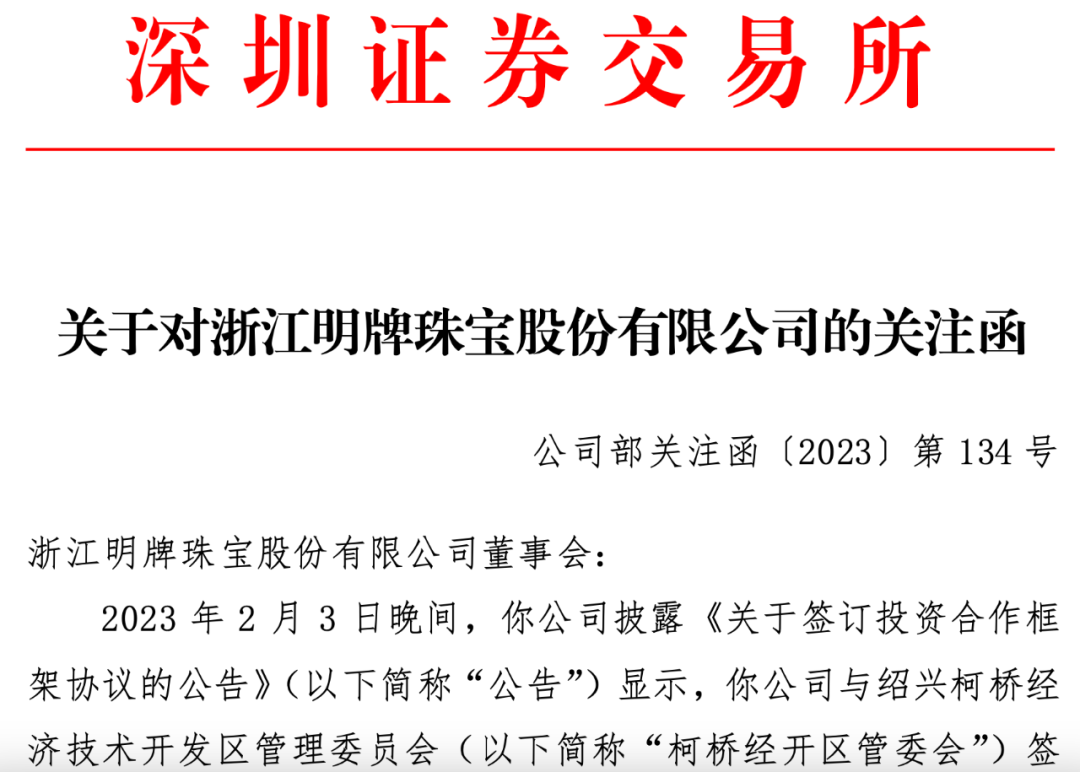 据公司情报专家《财经涂鸦》消息,明牌珠宝(002574.SZ)于2月6日收到深交所下发的关注函。深交所要求公司结合自身财务状况论证此前公告的100亿元拟投建光伏项目的可行性及资金来源,并说明公司是否存在信息披露不及时的情形。