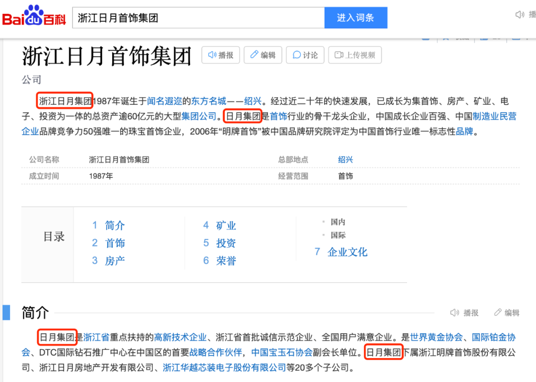 《财经涂鸦》通过并未查到名为“浙江日月集团有限公司”的存在。而查询明牌珠宝控股股东“浙江日月首饰集团有限公司”(持股29.6%)的百度百科词条,发现称呼该公司多处都简称为“浙江日月集团”或“日月集团”。这或许意味着,“浙江日月集团”与“浙江日月首饰集团”就是同一企业。