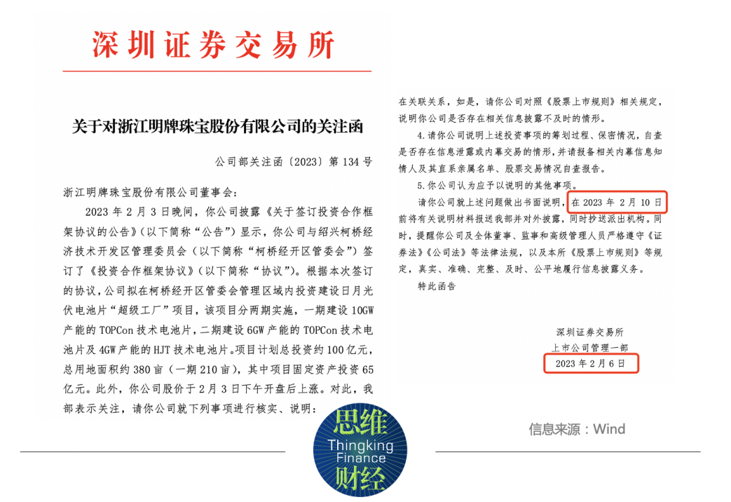关注函中同时提到,早在2023年1月12日,就有相关媒体报道了关于上述光伏项目的建设情况,对此,深交所要求明牌珠宝说明是否存在信披不及时等情形,项目相关方是否与其控股股东浙江日月首饰集团有限公司等存在关联。