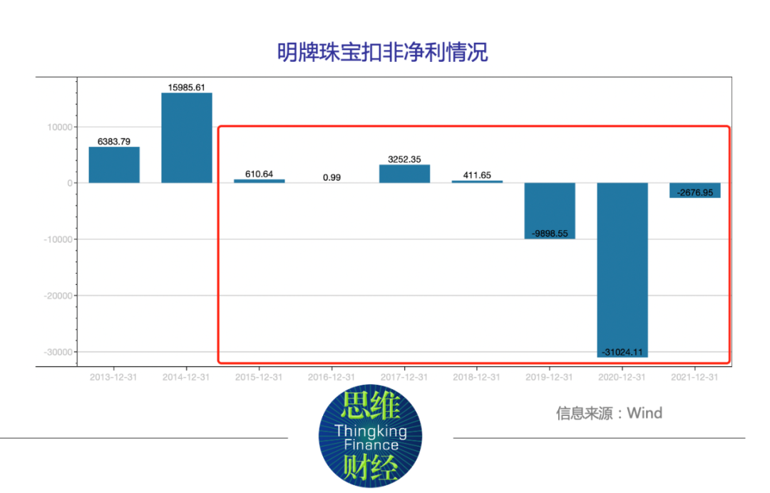 值得一提的是,彼时明牌珠宝能够扭亏为盈,主要源于其全资子公司持有瑞丰银行股票,产生公允价值变动收益达2.05亿元。否则,2021年其扣非净利润约为-2600万元。
