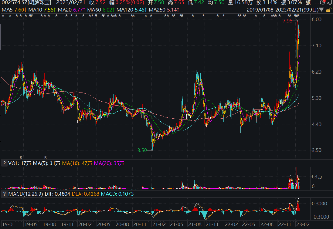 然而,在公告披露后的连续几个交易日,明牌珠宝股价一路上扬。2月6日,一字涨停,2月7日、8日,明牌珠宝股价分别上涨3.16%和5.26%,连续3个交易日内,公司股价累计计上涨19.4%。2月13日,明牌珠宝最高冲至7.96元/股,股价创出近四年来的最高点。