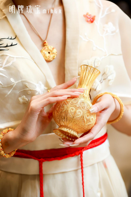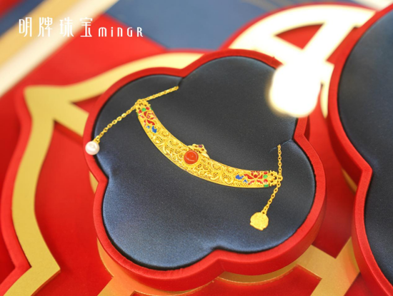 首先是文化金。2022年,明牌传家金与中国国家博物馆旗下文创品牌-国博衍艺,合作开发国匠系列珠宝,从典藏文物中获取灵感,将蕴含华夏文明图腾元素以珠宝呈现匠造现世臻品。文物穿越千年,与现代潮流碰撞,相连古今时空,让世界了解独特的东方华韵之美。推出凤冠长乐、令仪倾城、凤凰于飞、吉语开运等系列产品,开创IP合作新里程。