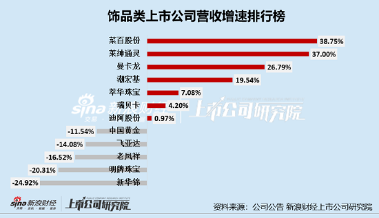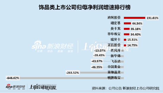归母净利润增速前三名分别为迪阿股份、潮宏基、曼卡龙,增速分别为131.61%、44.34%、35.18;归母净利润增速倒数三名分别为明牌珠宝、莱绅通灵、中国黄金,分别为-646.62%、-263.52%、-46.35%。