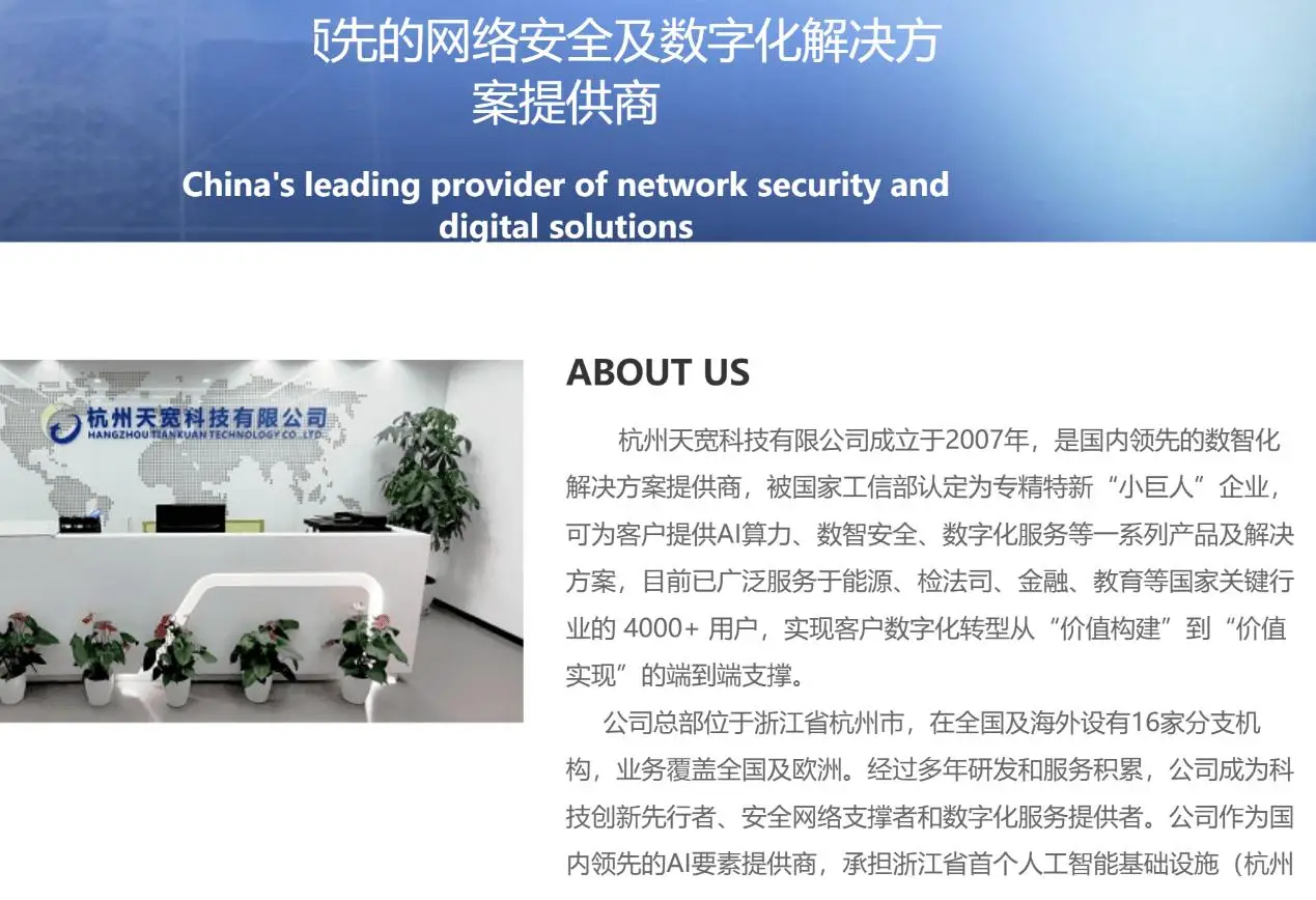 天宽科技,作为业界领先的数智化服务运营商和华为云CTSP(云转型服务提供商),在人工智能计算中心建设和运营、数字化转型服务解决方案以及端云一体化数字化、智能化产品等方面拥有显著优势。公司成立于2007年,注册资本达6264.51万元,注册地址位于浙江杭州西湖区,其业务范围广泛覆盖能源、检法司、金融、教育等多个国家关键行业。