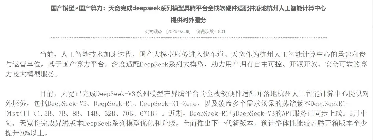 尤为重要的是,通过收购天宽科技,群兴玩具有望获得进入华为算力“朋友圈”的入场券,从而跻身国内智算中心的第一梯队。天宽科技在AI技术方面拥有深厚积累,特别是其自研的“天宽国产DeepSeek推理一体机”,基于昇腾AI技术,为国产大模型的高效部署与落地提供了全栈国产化解决方案。