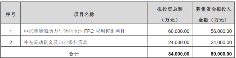 7月27日,中京电子发布公告,该公司拟向特定对象发行不超过1.2亿股,募资总额不超过8亿元,其中5.6亿元将用于中京新能源动力与储能电池FPC应用模组项目,2.4亿元将用于补充流动资金及归还银行贷款。