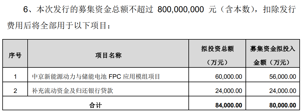 其中,公司拟投入5.6亿元用于中京新能源动力与储能电池FPC应用模组项目,2.4亿元用于补充流动资金及归还银行贷款。