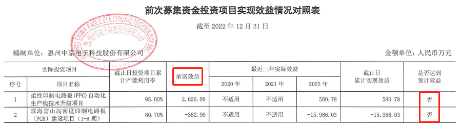 其中,柔性印制电路板(FPC)自动化生产线技术升级项目的承诺效益为2626万元,截至2022年末,该项目累计实现效益仅为580.78万元;珠海富山高密度印制电路板(PCB)建设项目(1-A期)承诺效益为-382.90万元,截至2022年末,该项目累计实现效益为-15986.03万元。