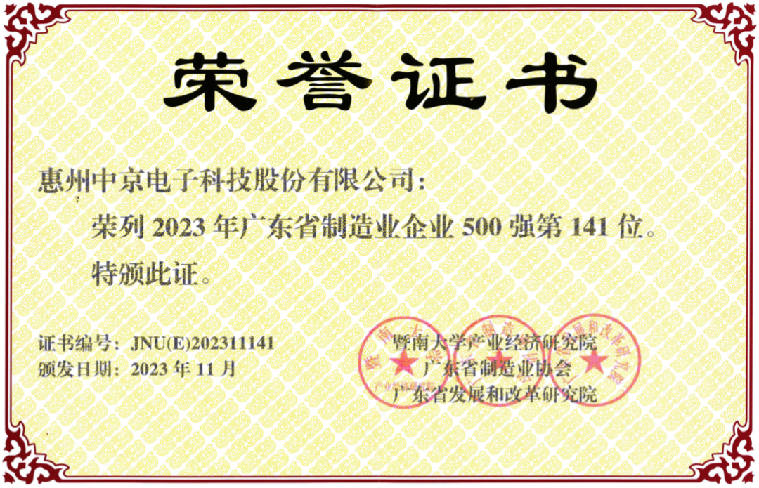 近日,广东省制造业协会、广东省发展和改革研究院及暨南大学产业经济研究院联合主办的2023广东省制造业500强企业峰会在佛山潭洲国际会展中心隆重举行。会议期间公布了“2023年广东省制造业企业500强”名单,中京电子凭借优异的成绩以及在业界中的出色表现,荣列2023年广东省制造业企业500强第141位。