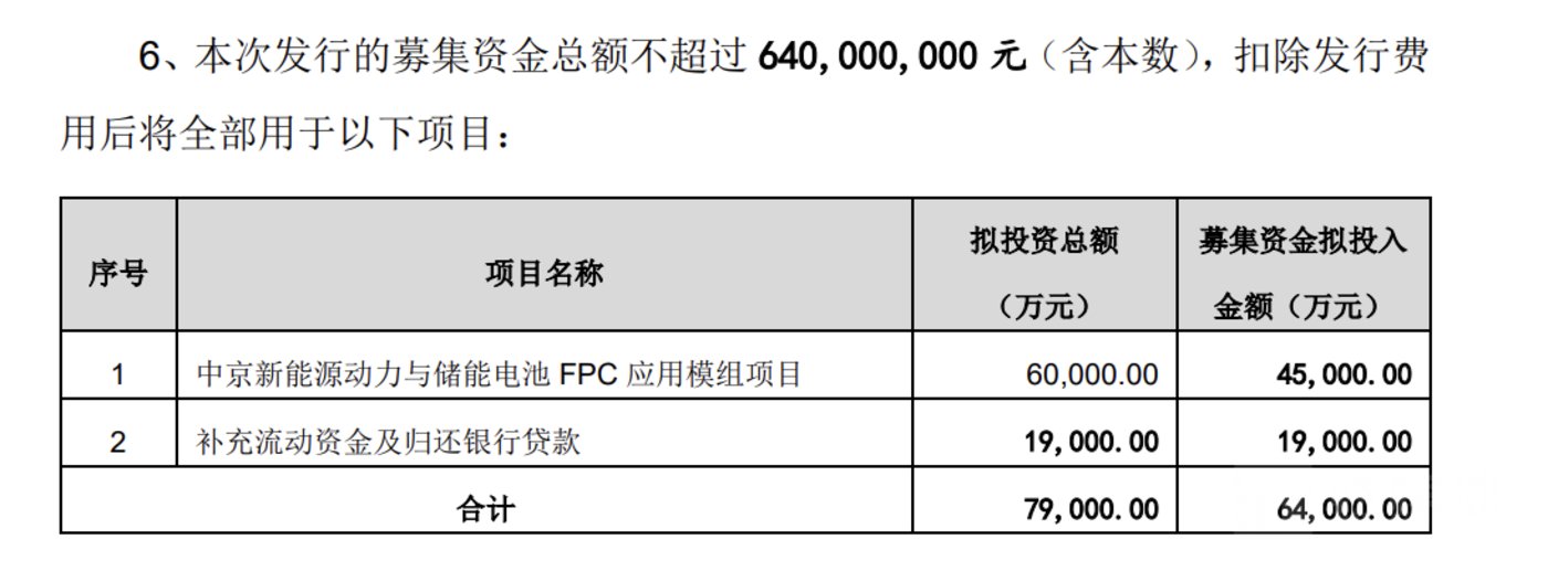 公司原计划募资总额不超过8亿元,其中5.6亿元用于中京新能源动力与储能电池FPC应用模组项目(项目一)、2.4亿元补充流动资金及归还银行贷款。调整后,公司的募资额上限下调至6.4亿元,上述两个募投项目的投入金额则分别降4.5亿元、1.9亿元。