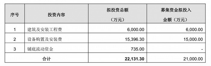 该项目拟投资总额为22131.30万元,主要包括建筑及安装工程费6000万元、设备购置及安装费15396.30万元、铺底流动资金735万元。本次发行募集资金拟投入21000万元,占拟投资总额的94.89%。